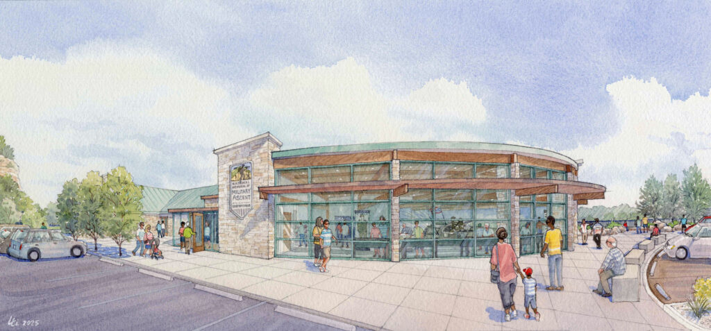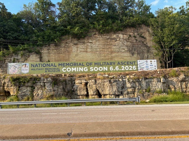 Spearheaded by Grafton Mayor (and veteran) Mike Morrow, the National Memorial of Military Ascent (or NMMA) is taking shape along the bluffs of Grafton, Illinois. In May, just in time for Memorial Day, the inspiring “radio man” statue was unveiled, and in July, our own Jamie Henderson presented some renderings to Governor Pritzker and state officials gathering to visit the site when a Seal Team Assault Boat (STAB) made its way “home” to Grafton. Artist Laura Linn continues to create, literally and figuratively, a colorful future for the museum and grounds, through both interior and exterior watercolor paintings. Signage that doubles as a preview to the museum—and to the anniversary of D-Day, June 6, 2026—also went up late this summer. We are so pumped for the NMMA to bring history alive for visitors! And, if you are as excited as we are and want to become a founding member, please follow the link here and consider a donation to the NMMA project.